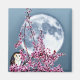 A painting of a Barn Owl perched on the flowering tree branch of a fruit tree, with a Full Moon in the background.
