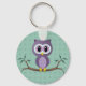 Basic Button Keychain has a cute purple cartoon owl on a limb with a green polka dot pattern background. Customizable.