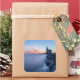 Square photo sticker of the Paard van Marken lighthouse during a blue sunrise on a very cold winter morning with ice on the wavebreaker rocks and motion blurred water of IJsselmeer lake on Marken Island, the Netherlands, creating a very moody atmosphere.