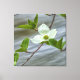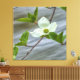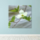 A close-up photograph showcases a delicate a Pacific dogwood blossom with a green centre, surrounded by vibrant green leaves. The flower is positioned on a slender brown branch, with a blurred background suggesting water or a soft, neutral surface. The image captures the freshness and simplicity of nature, highlighting the intricate details of the flower and foliage.