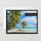 Postcard with a hanging palm tree on a white sand beach on a small desert island in the blue lagoon of tropical Rangiroa, an atoll near Bora Bora in the Tahiti archipelago French Polynesia in the Pacific ocean with a black border and the text: 'Bora Bora'.