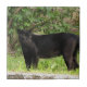 Pacing black panther cat in grass and wooded area.