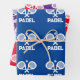 Padel racket Christmas wrapping paper sheets. Fun custom colour gift wrap for Christmas, Birthday and more. Blue red and pruple example. Cheerful pattern design for padel lover, tennis player, fan, friends, family, sports coach, kids etc. Happy Holidays! Personalize with your own name.