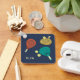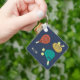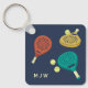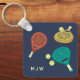 Create a personalized gift for your favourite padel player. This keychain features illustrations of padel rackets and balls in shades of terra cotta, gold and teal against a navy blue background. It's ready to be personalized with monogram initials in cream.