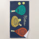 This personalized beach towel features a name in cream coloured script lettering along with illustrations of padel tennis rackets and balls in teal, terra cotta, gold, cream and yellow against a navy blue background.
