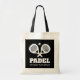 Padel Tote Bag for balls, tennis racket and more. Crossed racket and ball design plus humorous quote. Add your own personalized text optionally. Sporty bag for players, fans, coach, club trainer, party, event etc.