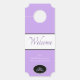 Greet your guests with this door hanger that takes the place of a welcome mat inside the home, apartment or hotel room. Shown here in a spritely shade of orchid purple with coordinating white and black colourings. "Welcome" text on front and back with a small oval and silver-grey coloured tiara-crown inside, use filter option for silver crown if you desire. Personalized line for your pageant name, your title or other special moto or statement. Customize this item or buy as shown.