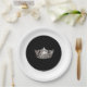 Party paper plate shown in a black and white combo colour scheme with a silver pageant crown print in centre.