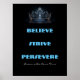 Sleek Black background on quality poster paper makes a fine piece of encouragement artwork. A glamourous Blue with Aqua highlighted crown perched above three words: Believe Strive Persevere along with a quote of "Dreams do come true".