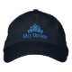 Shown in navy blue with a embroidered stitch turquoise blue colour crown and text. This cap has front text only shown with your title. Adjustable back.