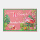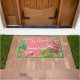 Tapis d'accueil de Flamant rose personnalisable (couleur arrière - plan et texte de nom). Les jolies couleurs coralliennes, jaune soleil et vert jungle dominent dans un paradis de feuillage et de fleurs. Les salutations tropicales accueillent vos invités. Il s'agit d'une version miroir de Flamant rose Paradise original avec différents placements et couleur arrière - plan de Coral rose.