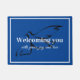 Le tapis de porte de peluche est montré dans le bleu et a une frontière et un texte blancs. Le texte lit "vous accueillir avec la paix, la joie et amour". A un contour d'une colombe derrière elle.