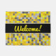 Les caractéristiques de conception ce de porte de tapis a grille-comme le motif carrelé de carrés ont coloré de diverses nuances de jaune et de gris. Il comporte également le message amical "accueil !" sur l'avant en jaune manuscrit-comme le texte.