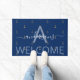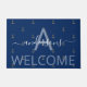 Un arrière - plan bleu marine classique. Décoré d'un faux motif d'ancre d'or. Avec le texte en gris : Bienvenue écrit avec de grandes lettres noires. Personnalisez et ajoutez votre nom de famille et votre première lettre. Le nom de famille est écrit avec un script de style à la main tendance avec des swashes. Lettres blanches et bleu clair. Elégant et moderne pour votre maison. Pour que les swashes ne suppriment que le nom de l'échantillon, laissez les espaces ou émoticônes devant et après le nom. Parfait pour une maison de plage ou votre bateau.