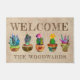 Ce tapis de portes personnalisées et coloré présente cinq cactus collage art en pot et de succulents plantes sur un arrière - plan en papier beige imitation Kraft. Le mot "Bienvenue" apparaît en lettres majuscules brunes esquissées en haut. Ajoutez le nom de votre famille ou d'autres textes ci-dessous dans le type marron correspondant.