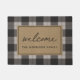 Ajoutez une touche de style ferme à votre entrée avec ce tapis de porte à motifs de buffle rustique en beige foncé et noir aux accents de bronze. "Bienvenue" apparaît dans le centre en écriture manuscrite décontractée; personnalisez avec votre nom de famille sous.