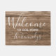 Porte de ferme pour accueillir les clients dans le style. Le arrière - plan en bois marron rustique ajoute une touche champêtre chic. Personnaliser avec le nom de famille.