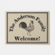 Faites bon accueil à votre famille et à invités avec une natte unique décorée d'une image vintage d'un coq et à votre nom de famille appareillés avec l'expression "accueil !" Le tapis est un beige neutre et a une frontière imprimée simple.