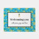 Le tapis de porte est affiché en bleu ciel et bordé d'ananas avec bordure noire intérieure et texte sur arrière - plan blanc. Texte : "Vous accueillir avec paix, joie et amour". Possède une seule icône d'ananas près du haut. L'ananas symbolisait l'hospitalité. Customisez ce tapis ou achetez tel quel.