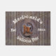 Un bar rustique western cowboy vintage à thème saloon, avec une vieille porte de grange en bois, une chaussure de cheval chanceuse, roues de wagon et bottes de cowboy, parfait pour les éleveurs et cowboys d'ajouter leur nom à.