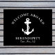 Tapis moderne chic sur le thème nautique pour votre bateau qui présente une illustration blanche d'une ancre sur un arrière - plan noir. Vous pouvez personnaliser le texte "Welcome Aboard" ainsi que le nom et l'emplacement de votre bateau dans une élégante typographie blanche.