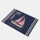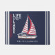 Porte unique de maison de lac personnalisée avec votre nom de famille et décoré avec un voilier avec voiles rouges, rayures et le dicton "La vie est meilleure au lac." Le modèle vous permet de taper facilement votre nom, un nom de bateau ou un autre texte. Pour le tapis de porte de taille moyenne, veuillez visiter : https://www.zazzle.com/nautical_navy_blue_white_red_sail_boat_lake_house_doormat-256640447603598195 Merci!