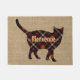 Une belle silhouette de chat à motifs plaid avec la typographie de bienvenue "Bienvenue". Couleurs chaudes contre burlap look texture arrière - plan .Design rustique de tapis de portes par Alma Wad pour les maisons amoureux de les chats.