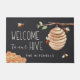Bienvenue aux invités avec ce mignon tapis de porte à thème abeille avec des illustrations aquarelles d'abeilles, nid d'abeille et une ruche, avec "bienvenue à notre ruche" en lettrage ivoire. Personnalisez avec votre nom de famille le long du bas.