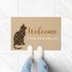 Tapis de porte avec un chaton plaid et un texte " Welcome - Un chaton adorable vit ici " motif de couleur chaude - arrière - plan de couleur solide tan. Idéal pour un amoureux des chats à la maison. Un bon avertissement à ceux qui ont une allergie féline. Conception par Alma Wad.