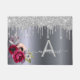Un arrière - plan à l'apparence d'argent faux avec parties scintillant d'argent goutte, la peinture goutte à goutte. Décoré de fleurs bordeaux. Personnalisez et ajoutez votre nom de famille et votre lettre monogramme, initiale. Lettres blanches et grises. Le nom est écrit avec un script en lettres manuscrites tendance avec des swashes. Pour que les swashes ne suppriment que le nom de l'échantillon, laissez les espaces ou émoticônes devant et après le nom.