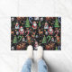 Christmas-themed pattern featuring Santa Claus, reindeer, snowmen, elves, Christmas trees, candy canes, and snowflakes on a black background