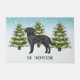 L'illustration originale de Destei d'un mignon chien noir de race Labrador Retriever. Le chien est placé dans une scène hivernale avec trois sapins verts et la chute de neige. L'arrière - plan est un dégradé bleu à blanc qui donne un aspect froid d'hiver. Il y a aussi une zone de texte personnalisable pour un nom.