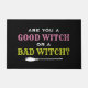 Ce drôle de paillasson d'Halloween se lit comme suit : "Es-tu une bonne sorcière ou une mauvaise sorcière ?", style typographique dans les tons blanc, rose et jaune vert avec l'accent du broomstick de sorcière.