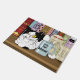 Un chat en tuxedo noir et blanc se réveille sur un plateau de cuisine avec ses livres de cuisine, tasse à café, sucre et crème.