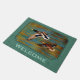 Les canards colverts en vol au-dessus d'un étang reflétant les couleurs de l'automne du feuillage voisin. Accentué d'un arrière - plan à motifs bleu-vert brouillard marin assorti.