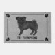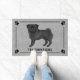 L'illustration originale de Destei d'un mignon chien de race Carlin couleur manteau noir. Le chien est debout et regarde vers le spectateur. La queue est courbée sur le haut du dos du chien. La bouche du chien est fermée et la couleur de l'oeil est marron. La couleur arrière - plan est gris avec une texture décorative. La texture peut être enlevée et la couleur arrière - plan peut être changée en n'importe quelle autre couleur, si vous le souhaitez. Le design est encadré par une bordure élégante. Il y a également une silhouette empreinte de patte de chien dans chaque coin. Sous l'image de chien il y a un texte personnalisable sont pour un nom de famille ou d'autres textes personnalisés comme "bienvenue", par exemple.