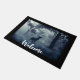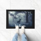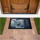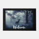 Un tapis de bienvenue avec la photo d'un cerf royal aux bois de bois debout dans une forêt ombragée au milieu d'arbres éclairés par le soleil. Neige tombant tout autour.