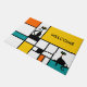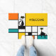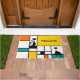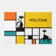 Tapis de bienvenue avec des chats noirs emblématiques du milieu du siècle sur un arrière - plan d'art moderne. Grille orange, jaune et turquoise de style Mondrian.