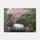 Porte de bienvenue décorée avec l'image de rose, fleurs de cerisiers qui drapent sur une passerelle en pierre de maçonnerie et passerelle. Un joli design floral ! Utiliser à l'intérieur ou dans les entrées couvertes. Sélectionnez votre taille de porte.