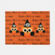 Tapis de porte avec un arrière - plan orange et un imprimé de hibou d'Halloween. Customisez ce tapis ou achetez tel quel.