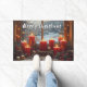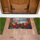 Pretty Door Mat with a view outside at the Winter landscape, perfect to dress up your home for Christmas. Beautiful bright red, lit candles on a window sill with pine cones, snow and red berries.