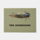 Bienvenue aux invités ou peut-être les effrayer avec ce tapis de porte qui présente une photo géante d'une cigale aux yeux rouges. En dessous du bogue se trouve un espace pour ajouter un nom ou un autre message en gras en lettres noires. La photo et le texte sont placés contre un arrière - plan de couleur vert olive.