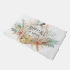 Bienvenue dans votre maison avec ce tapis de porte d'automne côtier avec un citrouille d'aquarelle entouré d'étoiles de mer et de coquillages de dollars de sable, corail, palmiers et eucalyptus verdure dans une palette de couleurs d'automne de couleur terre. Le message de bienvenue (illustré ici avec Happy Fall) et la deuxième ligne de texte peuvent être personnalisés.