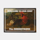 Un coq noir et rouge et ses poules décorent ce tapis de porte amusant qui dit, "Bienvenue à notre coop."