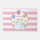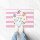 Un tapis de bienvenue avec un arrière - plan rayé rose et blanc. Un cadre circulaire blanc avec une bordure rose superposée avec votre texte à l'intérieur. A l'intérieur du cadre une illustration d'une mère et un bébé lapin debout ensemble. Bouches jaunes dans l'arrière - plan. Des papillons géants.