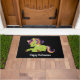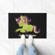 Un joyeux tapis de porte Halloween avec l'image d'une licorne de style Frankenstein. Couleurs violettes et vertes. Éffrayant mignon.