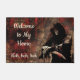 Image Déplaisante de Grim Reaper sur un arrière - plan sanglant avec les mots "Bienvenue à ma maison. Heh, hé, hé..." incrusté dans une police beige médiévale.