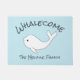 Un joli béluga blanc accueille les clients avec un jeu de mot "whalecome". Ajouter un nom de famille ou un autre message court sous la baleine.