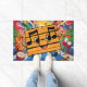 Un tapis de dessin animé avec un grand sourire et des notes musicales pour les yeux danse avec joie à côté d'une guitare, des tambours et une trompette. Bienvenue à vos proches dans le style avec ceci - Amuse notes de musique colorées Design For Your Feet Before Enter Doormat.