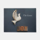 colombe blanche avec le mot 'joie' en lettres de bois sur un arrière - plan bleu - ajoutez votre nom de famille ou un autre texte ou laissez vide